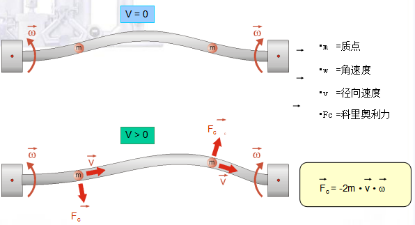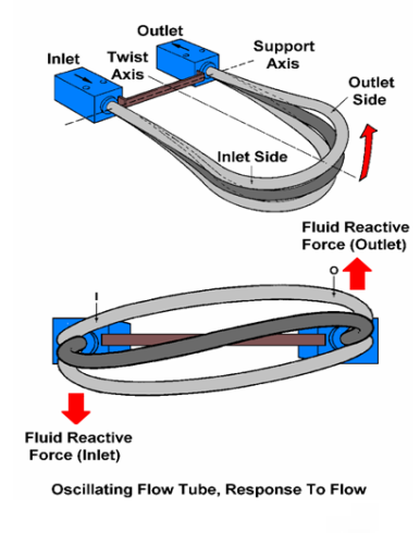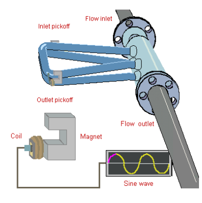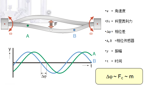 上述两张图为科里奥利力的技术示意图 在双管型质量流量计当中,入口处的分流管把流入的介质均等地一分为二,送到两根测量管中,这样保证了100%的介质流经测量管。两根测量管由于驱动线圈的作用,产生以支点为轴的相对震动。当测量管中有流量时,产生如图所示的科里奥利现象。 在每个流量管上,均有一组磁铁 / 线圈组,我们称之为入口检测线圈和出口检测线圈。由于相对振动,线圈在磁铁的磁场做切割磁力线的运动,在内部回路产生交流电信号。该信号能准确地反映线圈组间的相对位移和相对速度。通过监测该交流信号,我们可判断测量管的运行状态